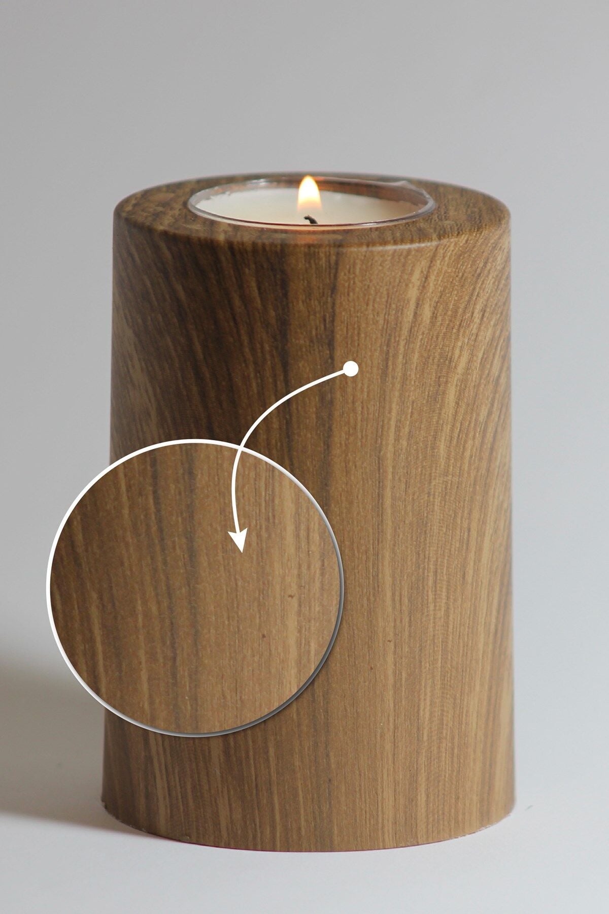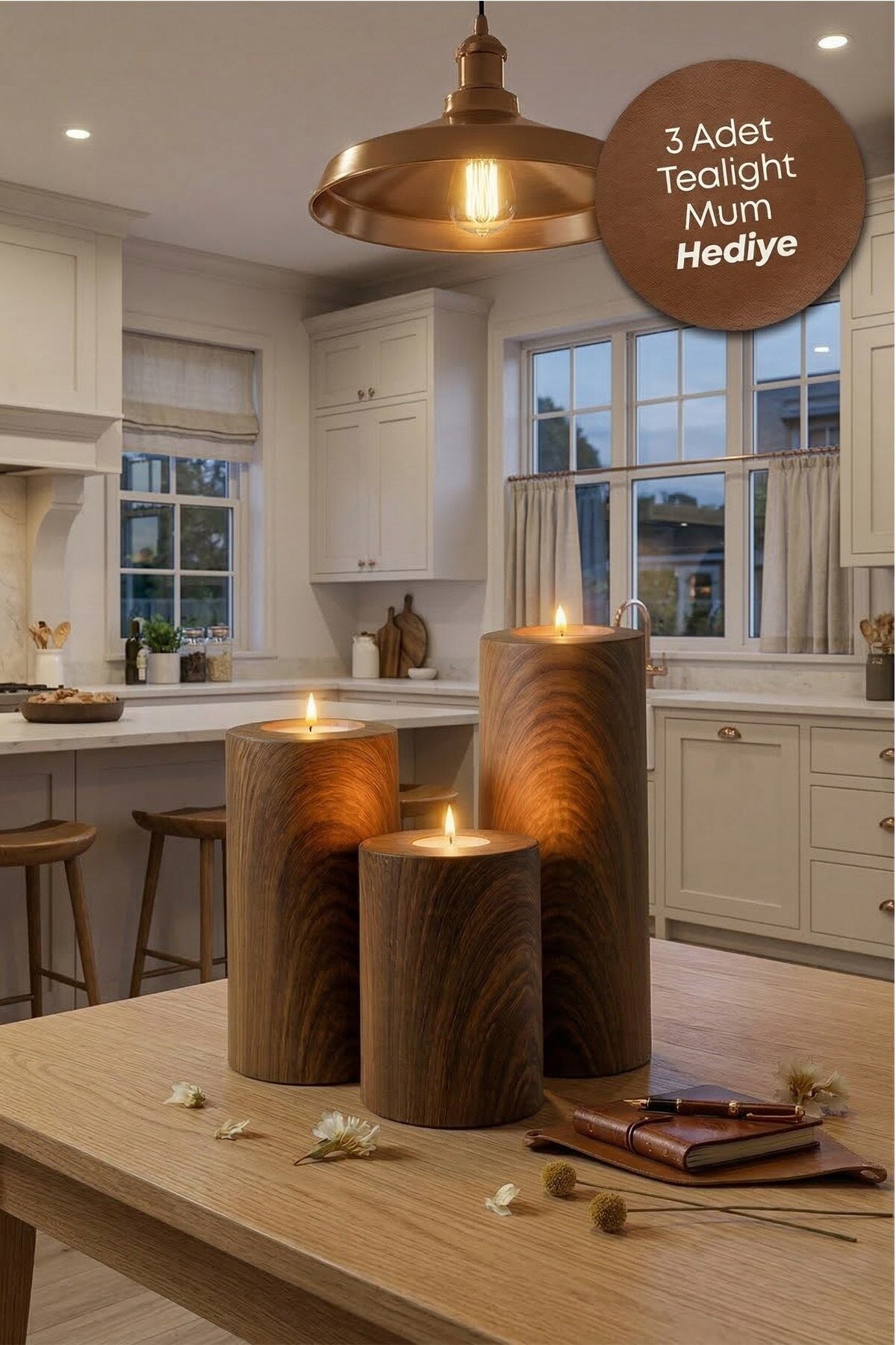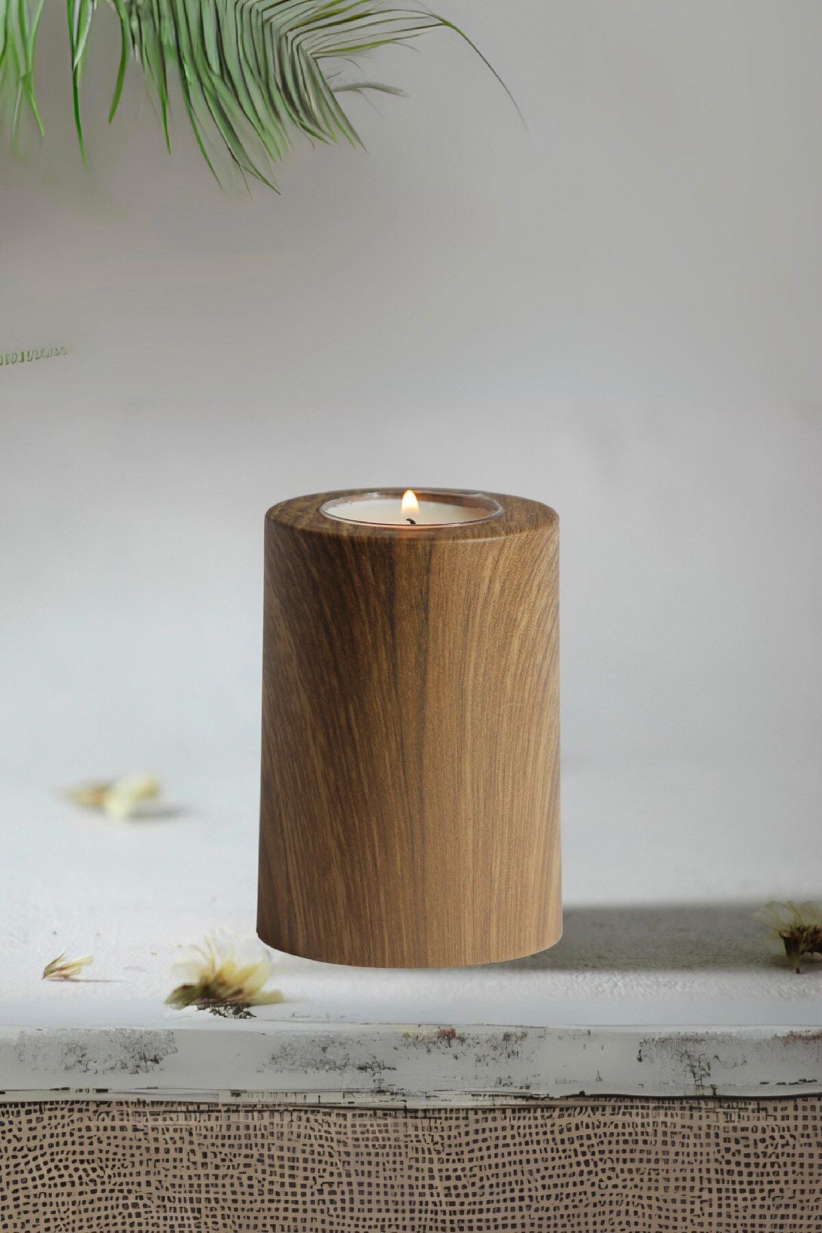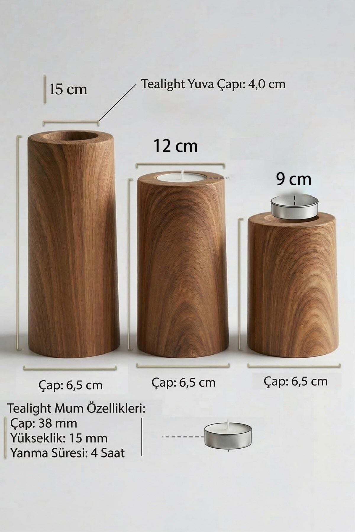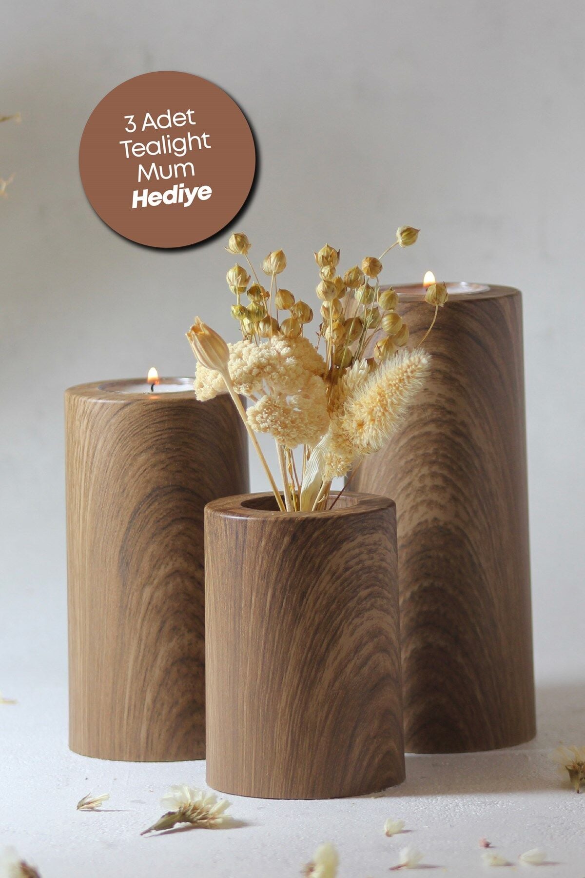 3 Lü Ahşap Kaplama Yüzey Mumluk Dekoratif Tealight Set Mum Abs Plastik