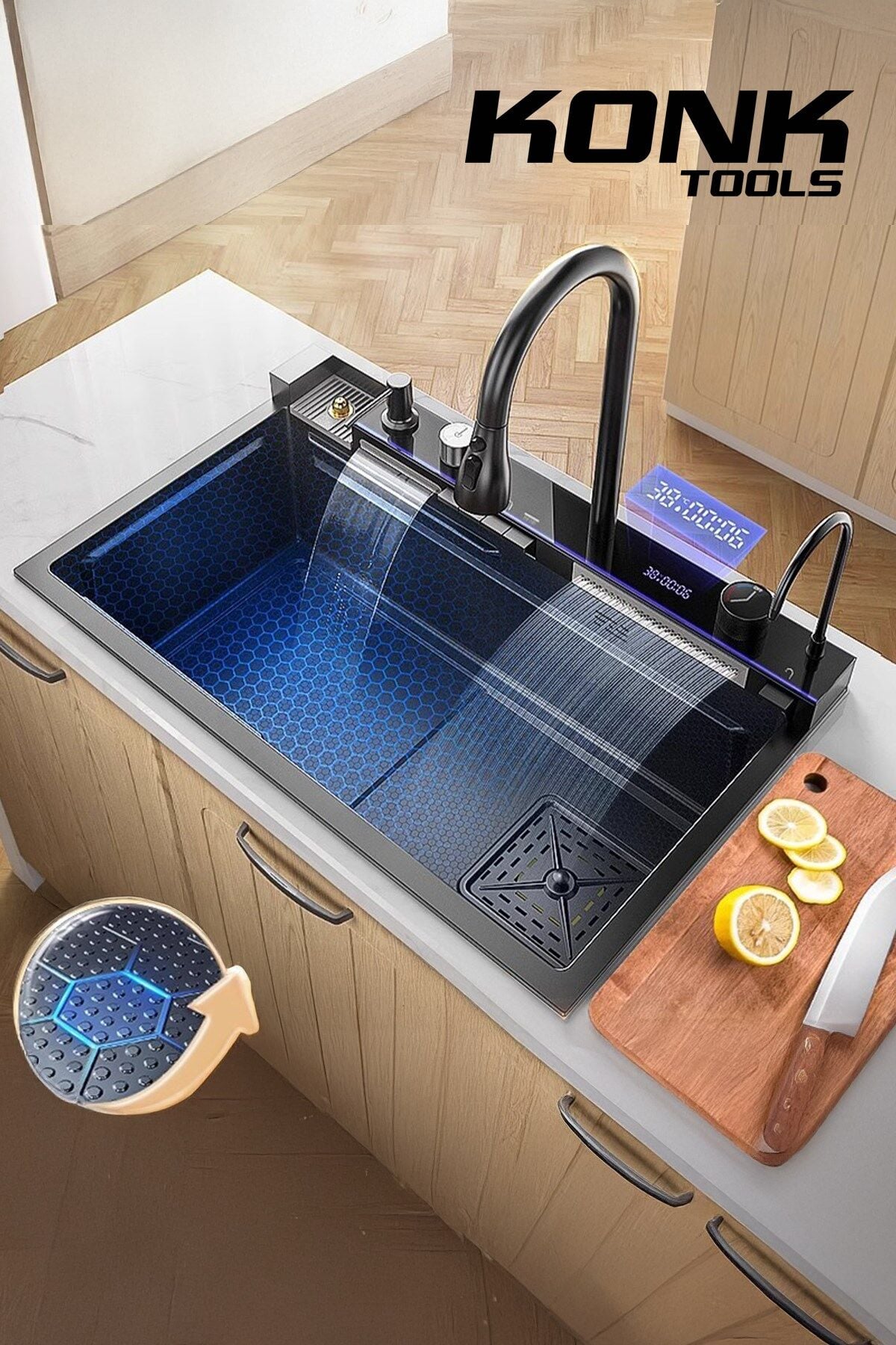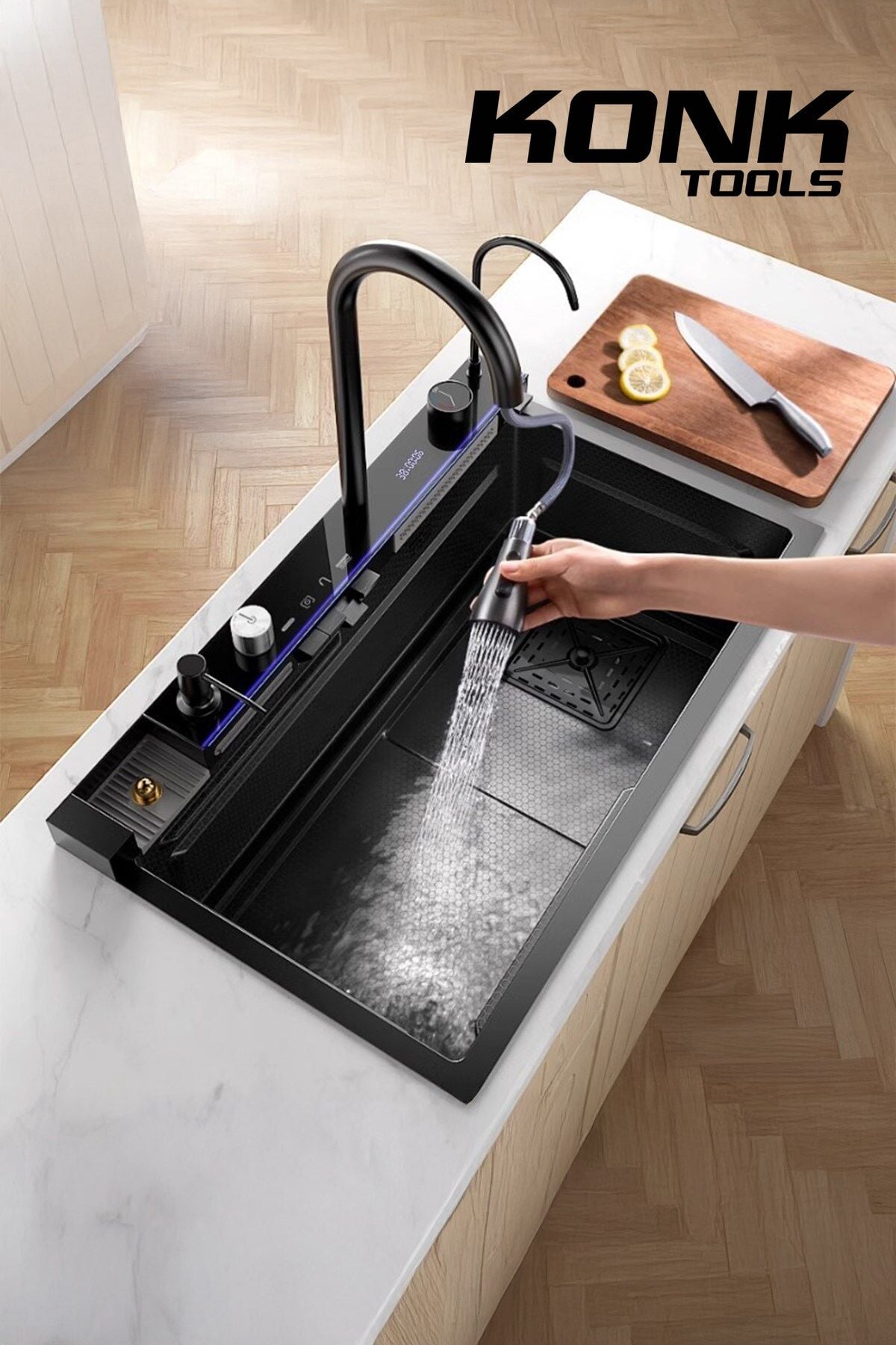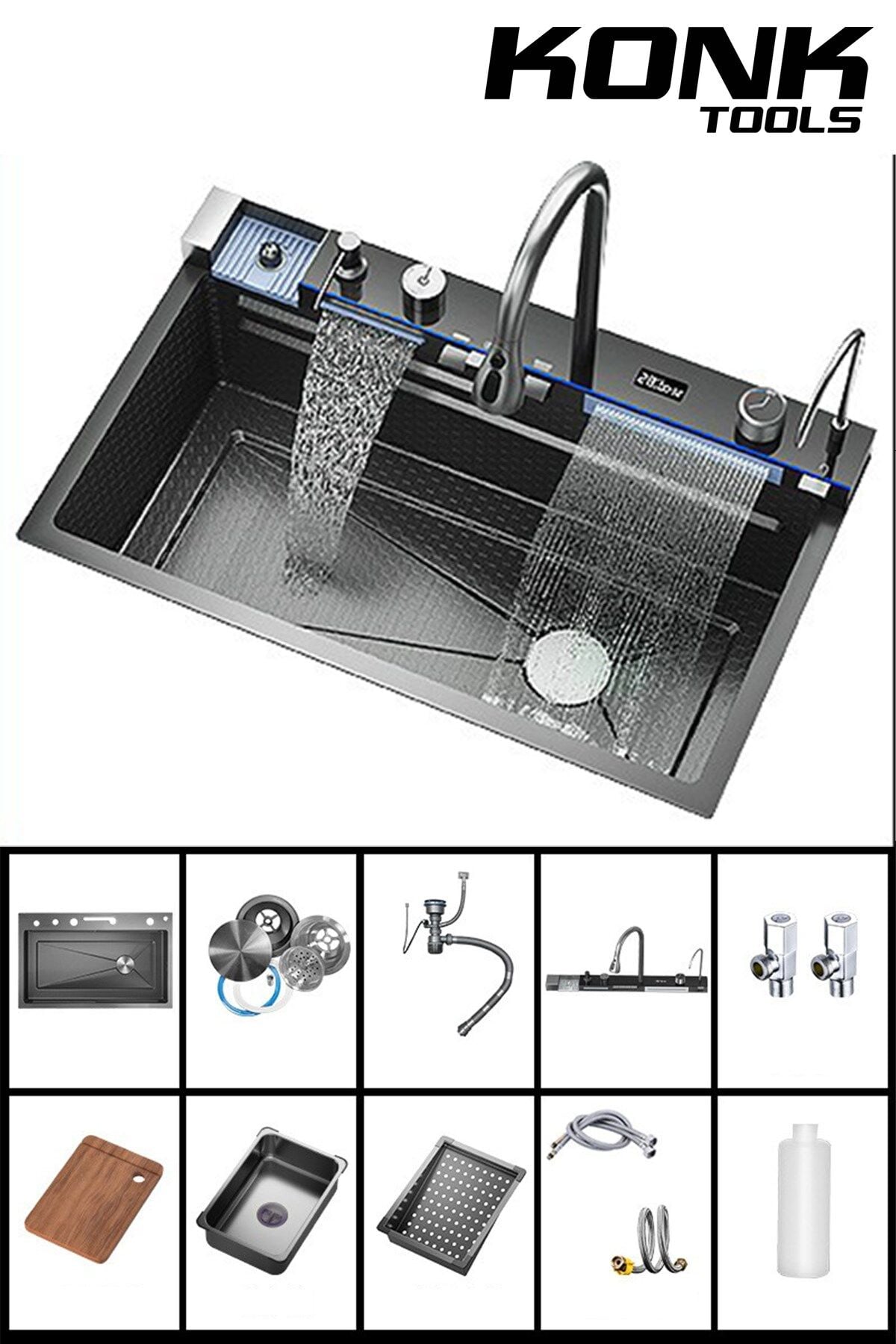 - Piyano 5 Tuşlu Akıllı Teknolojik Siyah Nano Mutfak Evye Seti Şelale Bataryalı Ledli Şelale Mutfak Bataryası
