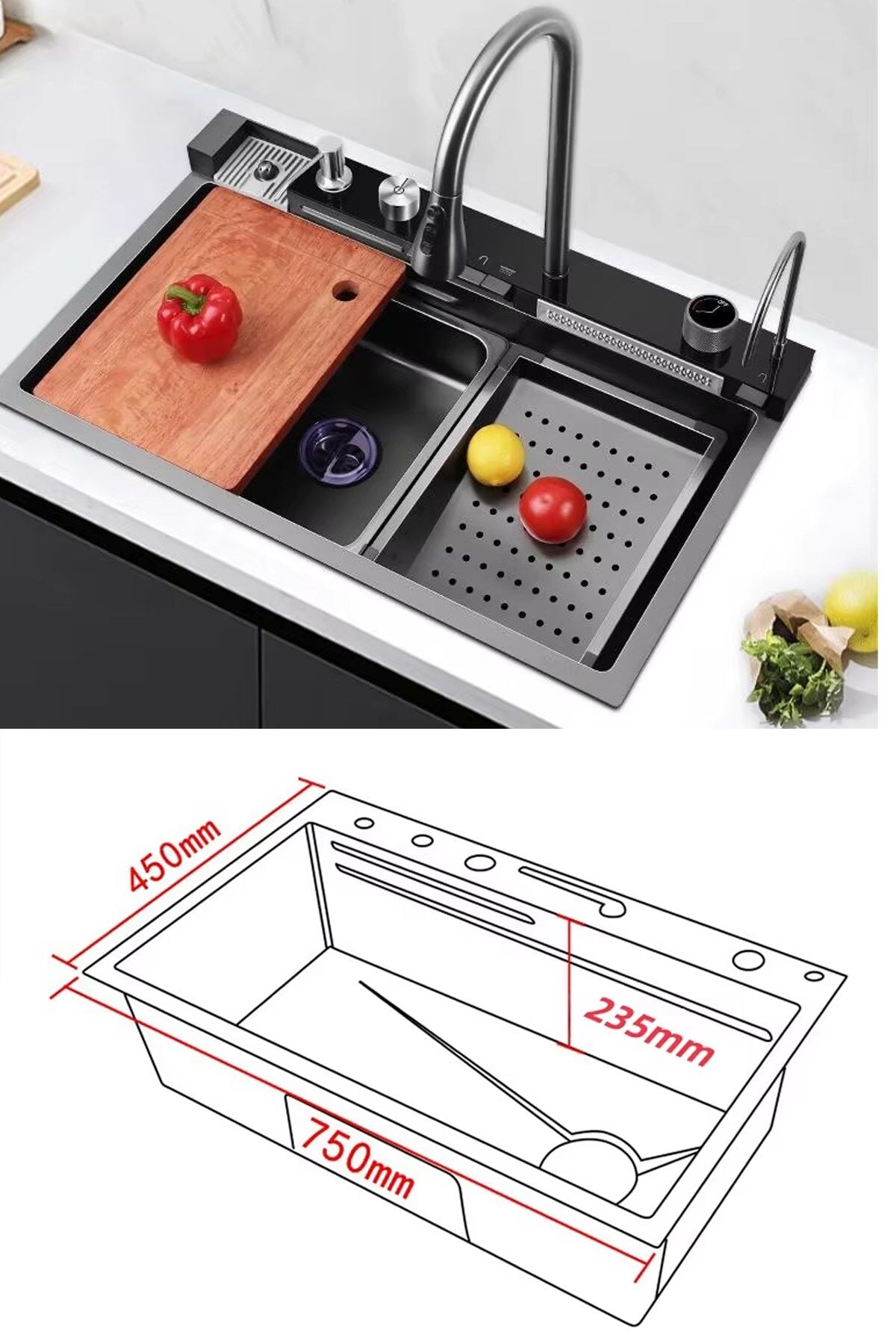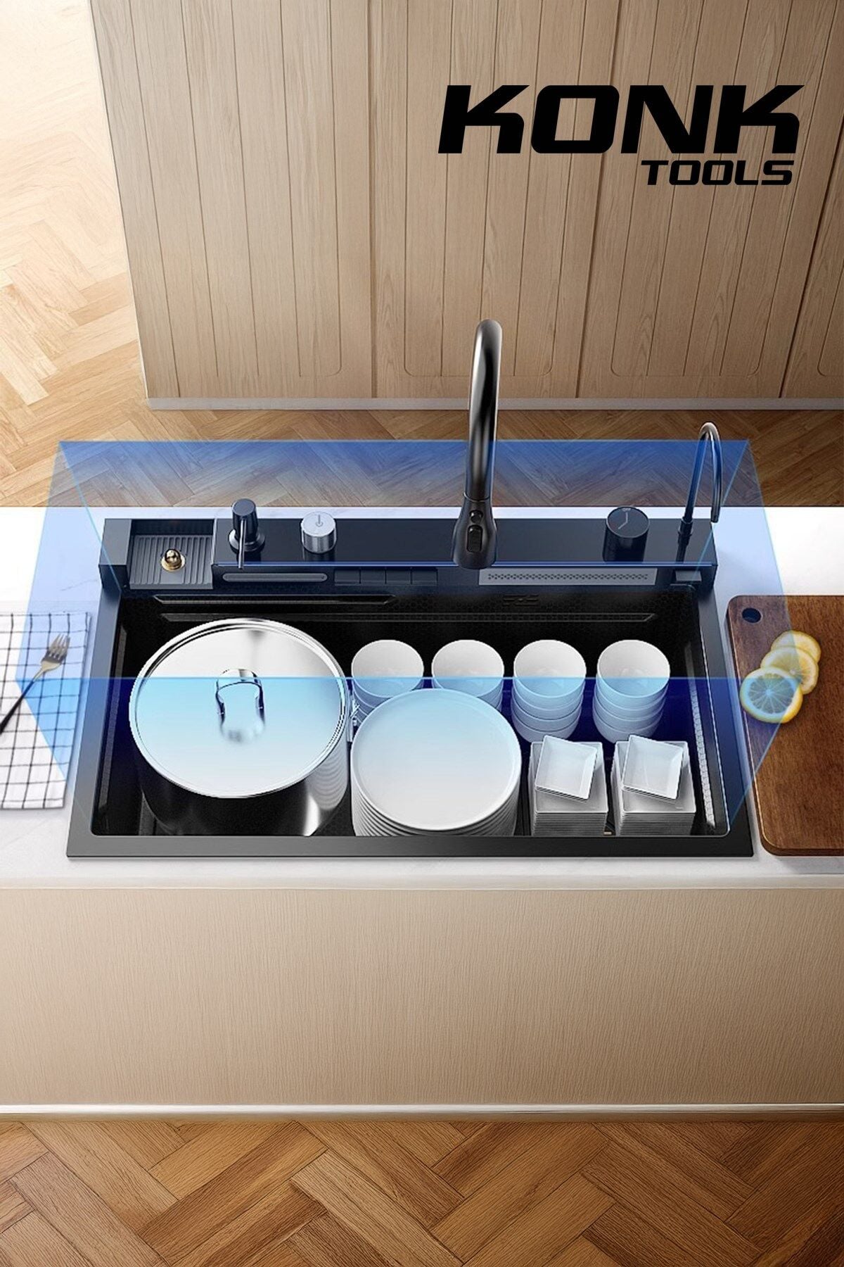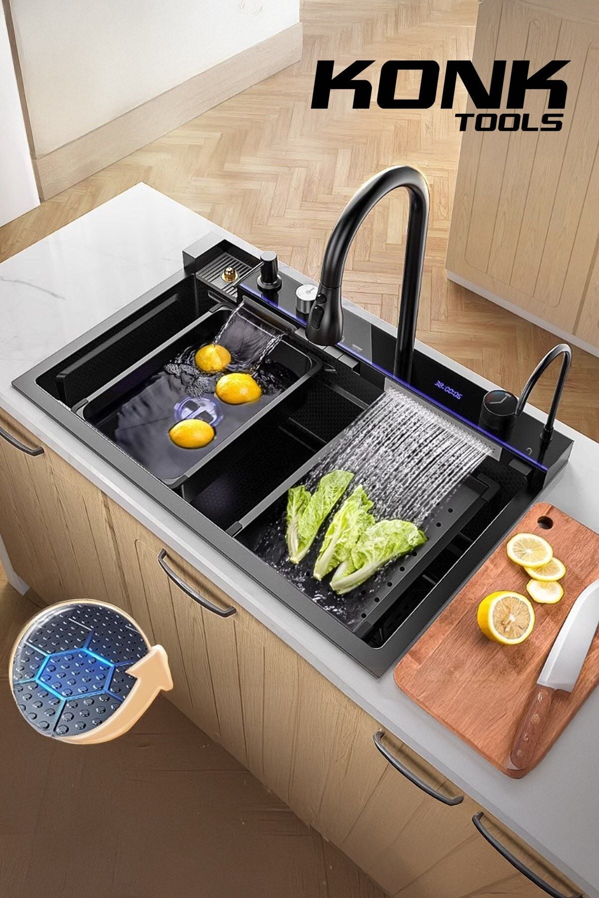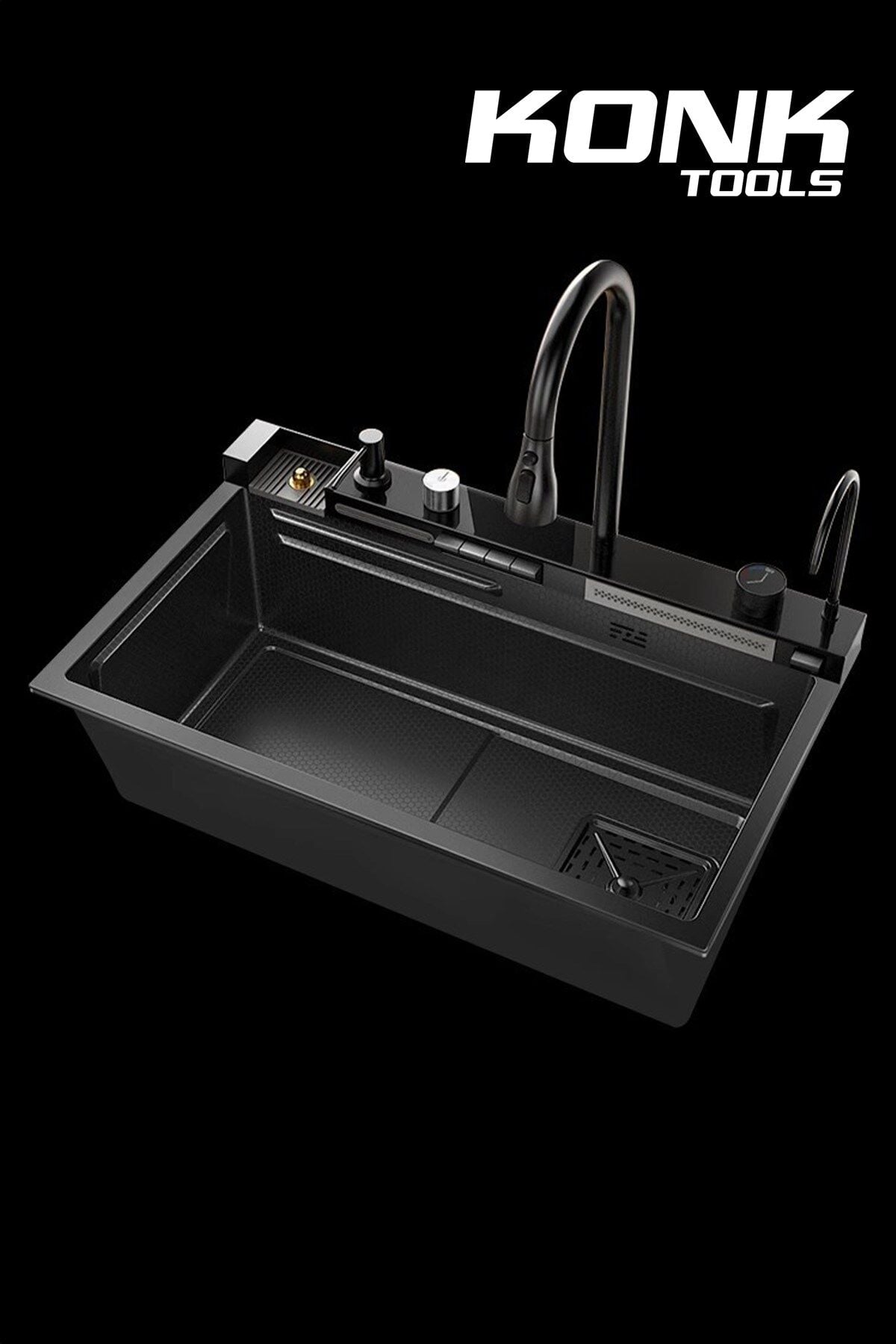 - Piyano 5 Tuşlu Akıllı Teknolojik Siyah Nano Mutfak Evye Seti Şelale Bataryalı Ledli Şelale Mutfak Bataryası